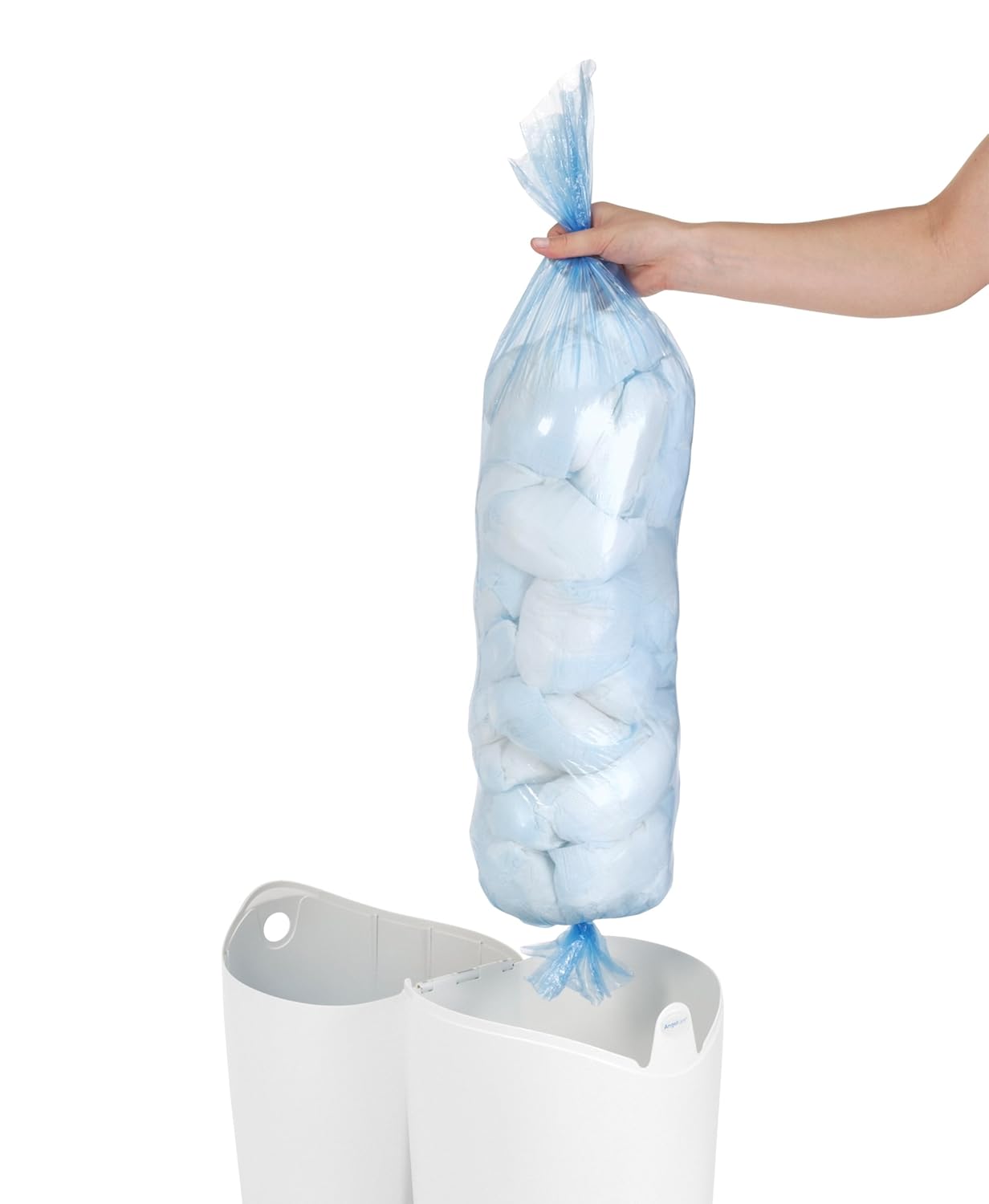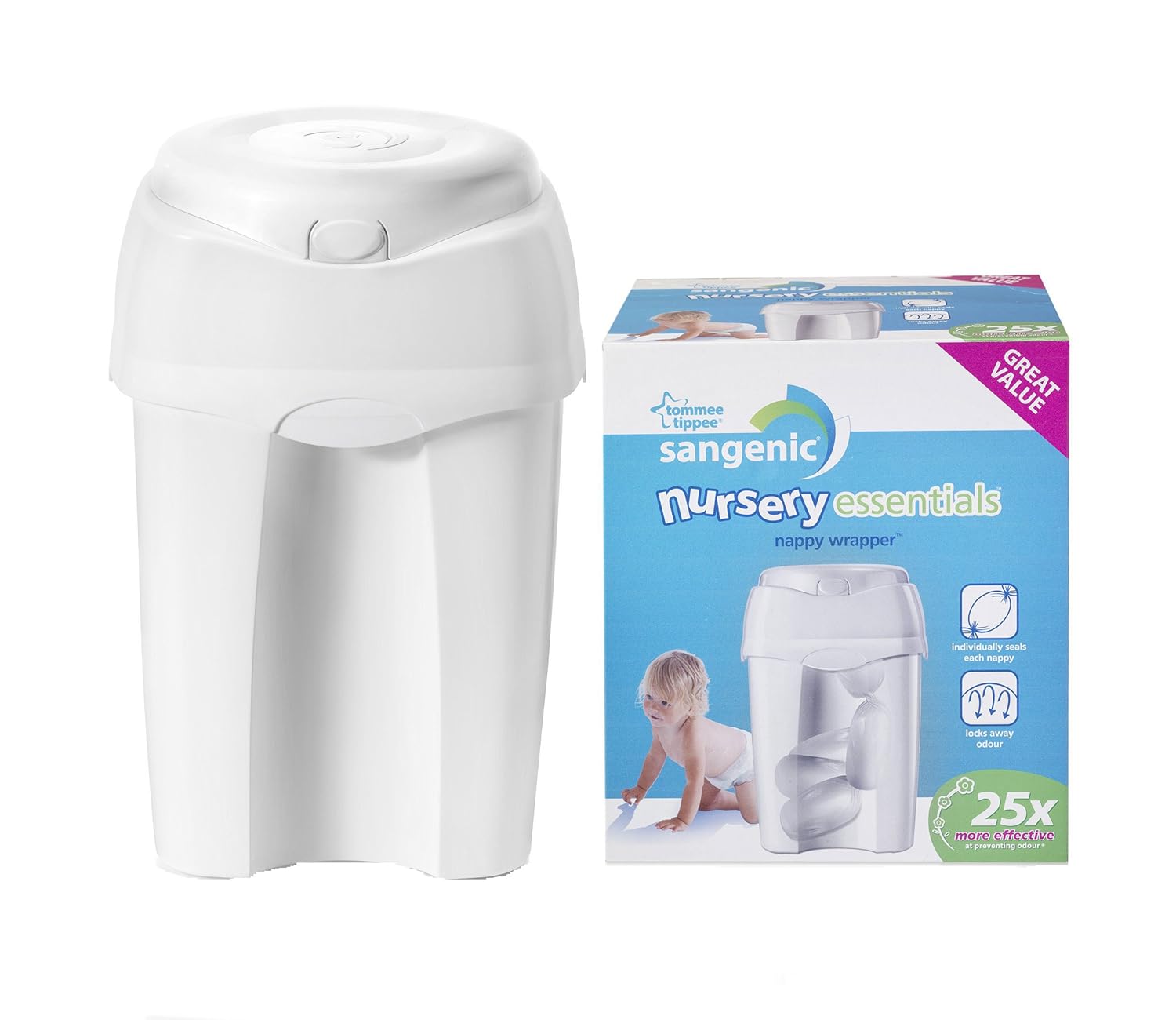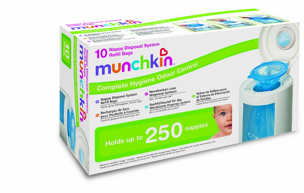 The Nappy Disposal System by Munchkin is easy to use from start to finish - one handed use. A patented self sealing system called Odour Lock automatically seals the bag when the lid is closed. Snap Seal technology means there is no requirement for cutting or typing of the bags. Hygiene Vent Odour Control dispenses odour eliminating baking soda to continually absorb odour after every use. The Nappy Disposal System comes fully assembled and with 3 bag refills.